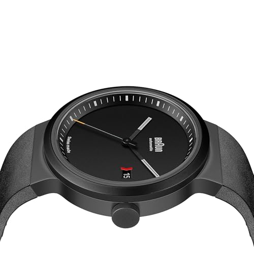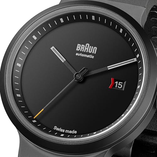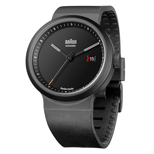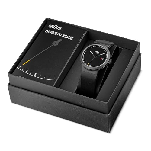 Braun - براون ساعة سويسرية للرجال بعرض انالوج و3 عقارب مع عرض التاريخ ومينا اسود وسوار مطاطي اسود، هيكل من الستانلس ستيل بلون رمادي داكن مقاس 40 ملم، موديل BN0279BKGNG