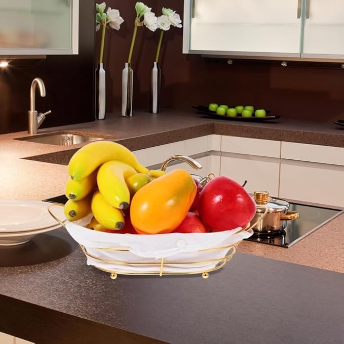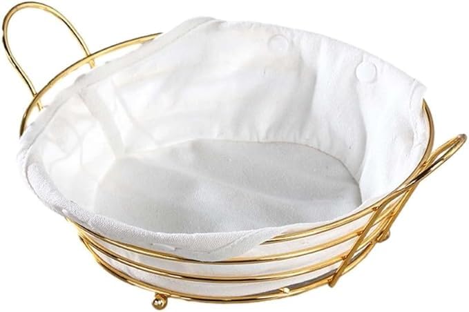 Generic - سلة خبز ذهبية مع بطانة قماشية بيضاء، سلة تقديم حديثة للحفلات والفواكه والخضروات وطاولة المطبخ، منظم لسطح الطاولة، وعاء معدني مزخرف (لون أبيض دائري)