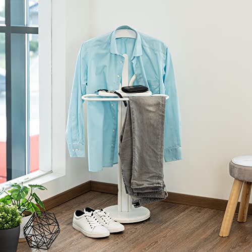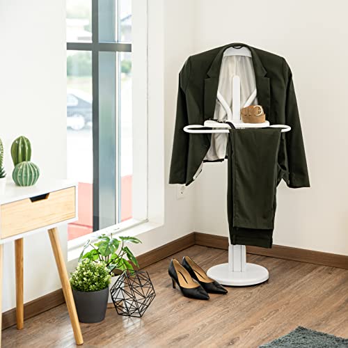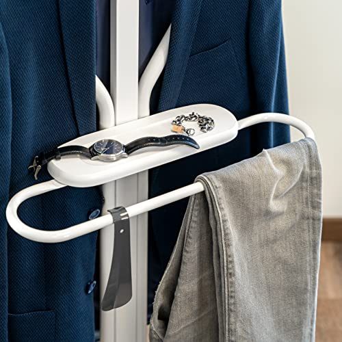 - دائمًا في الخدمة - خادم الملابس الخاص بك هو بالفعل خادم صامت. يحافظ على ملابسك خالية من التجاعيد ويحتوي على رف لساعتك وهاتفك ومجوهراتك. يمتد الحزام العريض منطقة كتف ملابسك. يتميز قضيب الملابس المحيط بقطر واقعي لتجنب التجاعيد في بنطالك أو تنانيرك. توجد مساحة كافية على القضيب لربطات العنق أو الأوشحة أو الأحزمة. يحافظ خادم الملابس الخاص بك على الأشياء مرتبة - حتى عندما تحتاج إلى الذهاب بسرعة!