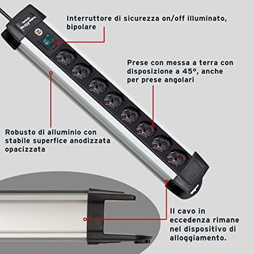 - شبشب كهربائي مع مفتاح أمان: يحتوي شريط الطاقة الممتاز ألو لاين مع حواف من الألومنيوم على 10 مقابس إيطالية (10/16 امبير) مع ترتيب 45 درجة، مثالي أيضًا لمقابس الزوايا. يوجد مفتاح أمان مزدوج بإضاءة خلفية قطبية (تشغيل/إيقاف). 3 متر، نوع الكابل: H05VV-F 3G1.5