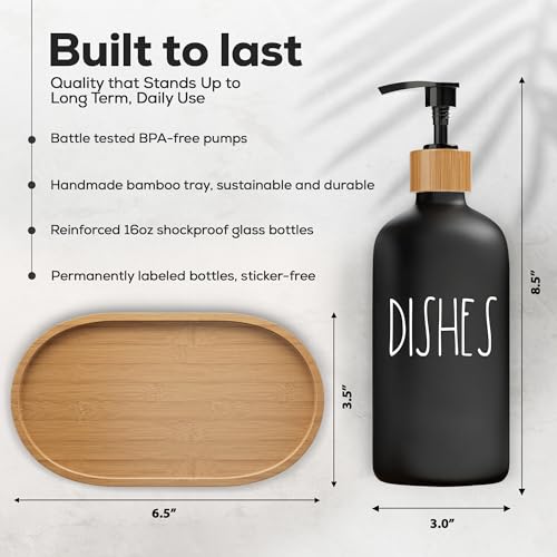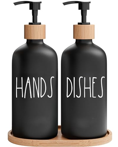 Brighter Barns - موزع صابون لليدين والأطباق لحوض المطبخ من برايتر بارنز- مجموعة موزع صابون مطبخ المزرعة مع صينية - موزع صابون زجاجي - ديكور مطبخ ريفي عصري بنمط بوهو (أسود)