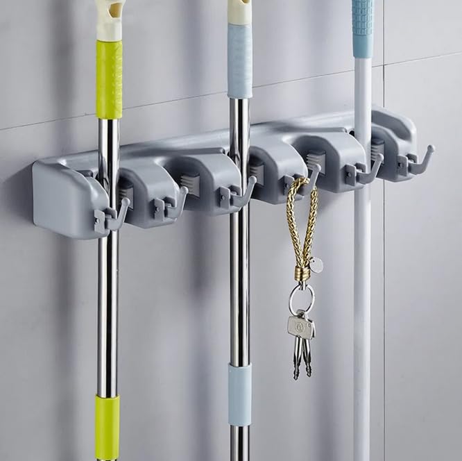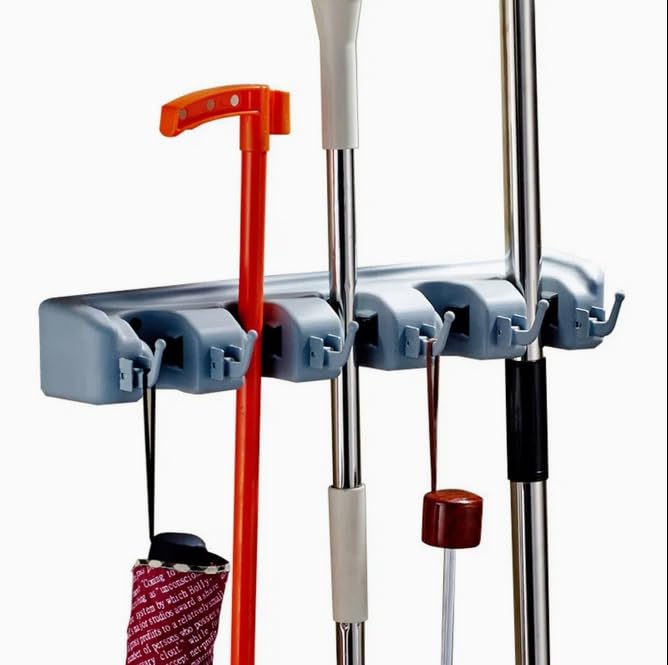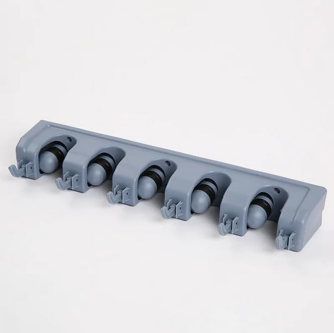 Generic - حامل مكنسة وممسحة يثبت على الحائط مع 5 فتحات و6 خطافات، رف منظم ادوات التنظيف موفر للمساحة، مقبض مانع للانزلاق، تخزين بلاستيكي يثبت على الحائط للمطبخ والحمام والشرفة، رمادي