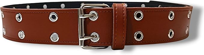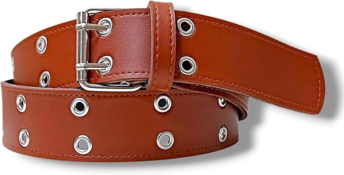 Generic - حزام جلد بني بحلقات معدنية للنساء، تصميم بشوكة مزدوجة، مقاس قابل للتعديل للبنات - النساء
