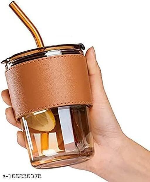 Generic - كوب زجاج فويكس مع غطاء وشفاطة زجاج وحافظة جلد مقاومة الانزلاق، للمشروبات الساخنة والباردة مثل الشاي والقهوة وعصائر السموذي وعصير الفاكهة، مج للسفر، بني