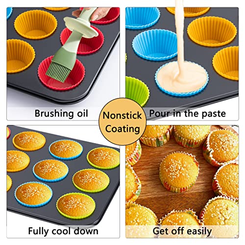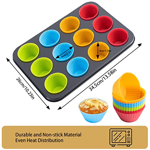 Generic - صينية كاب كيك ومافن 12 عين مع 12 كوب سيليكون، قالب للخبز والكافن والكاب كيك من الصلب الكربوني، قالب خبز قياسي للكيك