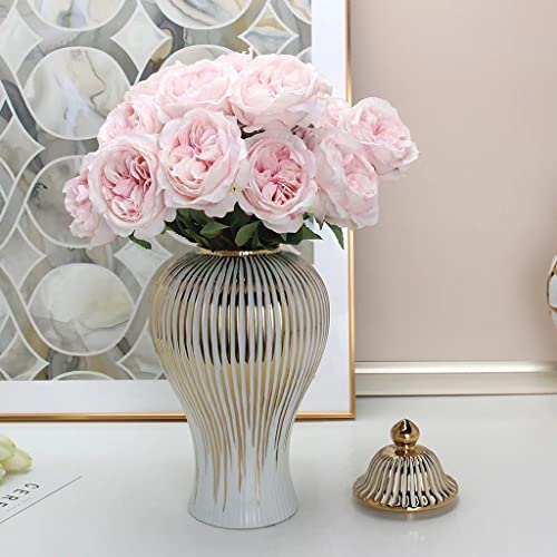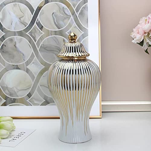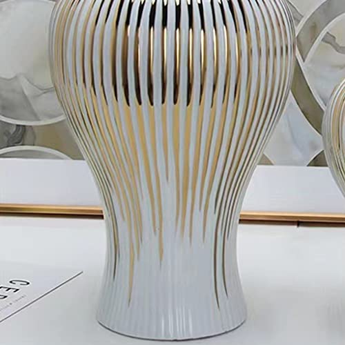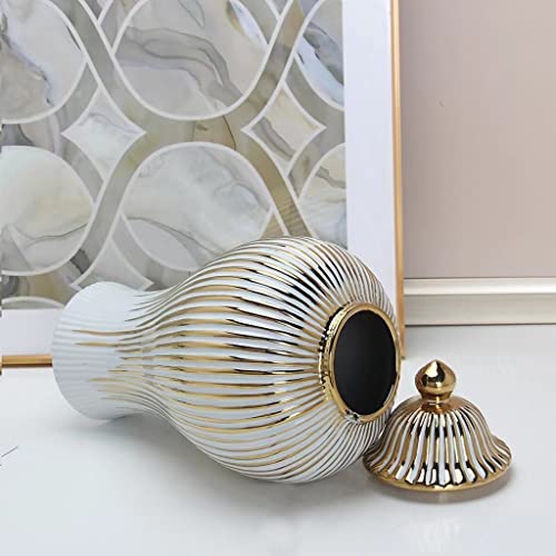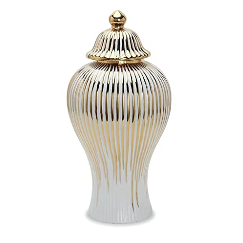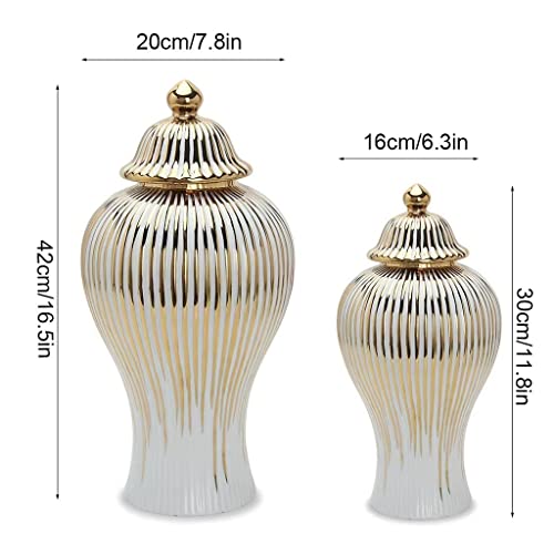 BRULEA - برطمانات زنجبيل سيراميك ريفية مع غطاء من بروليا - مزهريات بيضاء وذهبية بانماط مخططة مطلية بالكهرباء - ديكور غرفة المعيشة والعائلة (اللون: ذهبي، المقاس: 20 × 42