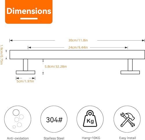 - الأبعاد: يبلغ الطول الكلي 30 سم. طول مساحة التعليق 17 سم (170 ملم). الإسقاط 8 سم (80 ملم). يمكن استخدام حامل الفوط هذا في المطابخ والحمامات وغرف الغسيل، يمكنك تثبيته على جانبي الخزانة أو باب الخزانة لتخزين فوط اليد والأطباق عند الاستخدام.