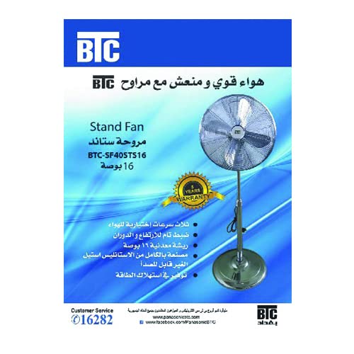 BTC - مروحة موديل SF40STS16 من بي تي سي - 40.6 سم - 3 سرعات - مزودة بدلايات، متعدد الالوان، 75.0 واط