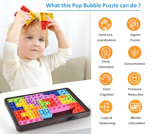 - يسلط الوصف الإنجليزي الضوء على تصميم أحجية فقاعات تهدف إلى تحفيز الدماغ، ويتم تقديمها كلعبة حسية لتخفيف التوتر.