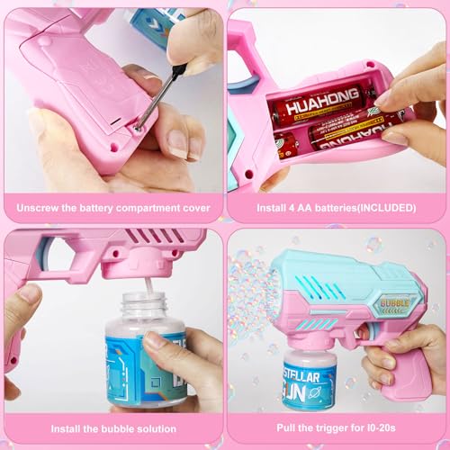 - سهل الاستخدام: مسدس الفقاعات المحمول للأطفال أوتوماتيكي بالكامل. كل ما عليك القيام به هو إدخال 4 بطاريات ايه ايه (متضمنة) والزجاجة مع محلول الفقاعات، اضغط على الزناد (انتظر 10-20 ثانية للاستخدام الأول) وسيتم رش الآلاف من الفقاعات الملونة بالتساوي.