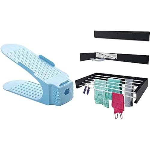 Generic - منظم أحذية، 10 قطع، أزرق + منشر ملابس سما من الفولاذ يمكن جمع لأبعاد 100 سم عرض و13 سم ارتفاع و4 سم عمق، ويمكن فصله بأبعباد 100 سم علاض و13 سم ارتفاع و50 سم عمق، خليط معدني صلب