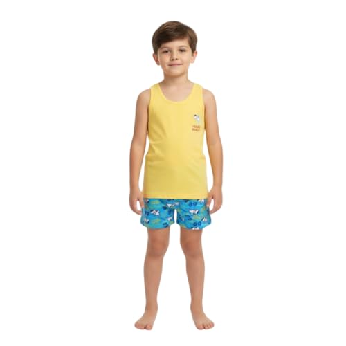 Buongiorno - طقم ملابس داخلية قطنية للاولاد من بونجيورنو، مكون من قطعتين توب كات اصفر بدون اكمام وشورت بنمط الفضاء الازرق