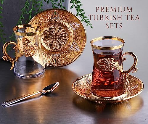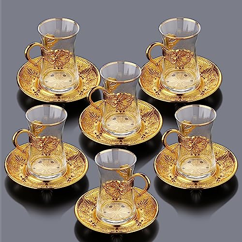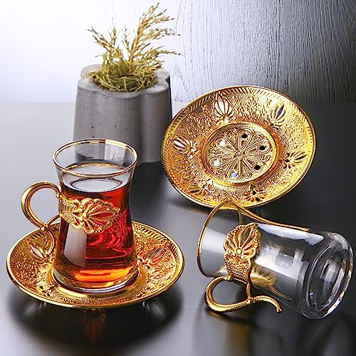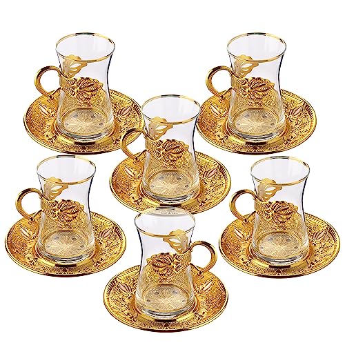 Busem Hediyelik - طقم شاي عربي تركي فاخر من سيفا مكون 6 اكواب مع حوامل وصحون معدنية ذهبية فاخرة بنمط عثماني تقليدي. ديكور عتيق فريد مجموعة هدايا مصنوعة يدويا