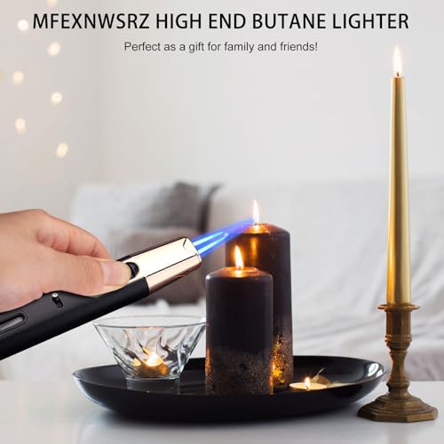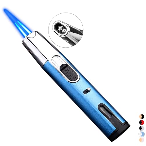 Mfexnwsrz - ولاعة شعلة غاز البوتان، قابلة لإعادة الملء والتعديل، ولاعة مزدوجة مقاومة للرياح مع نافذة وقود مرئية للشواء والشموع والتخييم والمدفأة والمطبخ والألعاب النارية (خالية من البوتان) (أزرق)