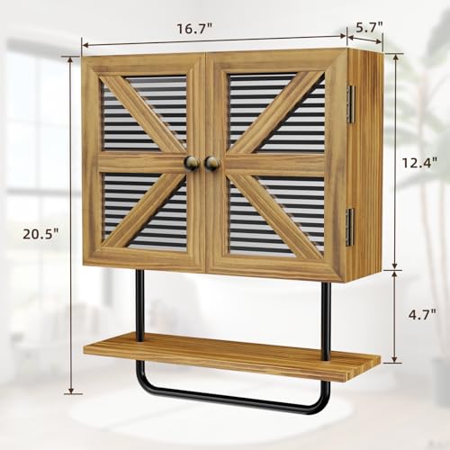 Butizone - بوتيزون خزانة حائط صغيرة للحمام مقاس 17 × 21 انش، خزانة ادوية بتصميم بيت المزرعة تثبت على الحائط، خزانة تخزين خشبية من 3 طبقات مع رف قابل للتعديل وقضيب منشفة للحمام والمطبخ وغرفة الغسيل، بني