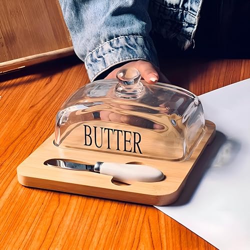 Generic - عبوة زبدة - برطمان زجاج محكم الغلق مع حامل خشب وسكينة، مثالي لتخزين الزبدة والحفاظ عليها طازجة