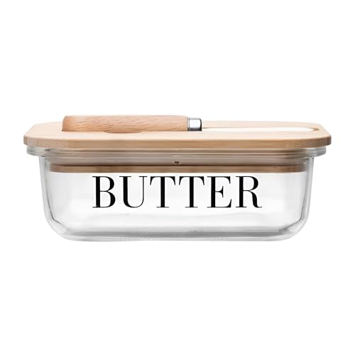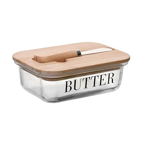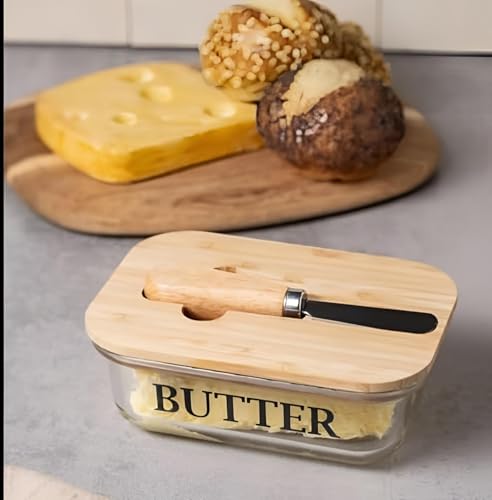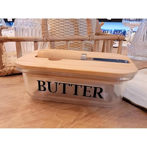 Generic - طبق حفظ الزبدة - وعاء زجاج شفاف وأنيق مع غطاء من الخشب الطبيعي وسكينة مدمج، مثالي للزبدة بوزن 250 جرام، مما يبقيها طازجة ويسهل الوصول إليها