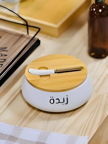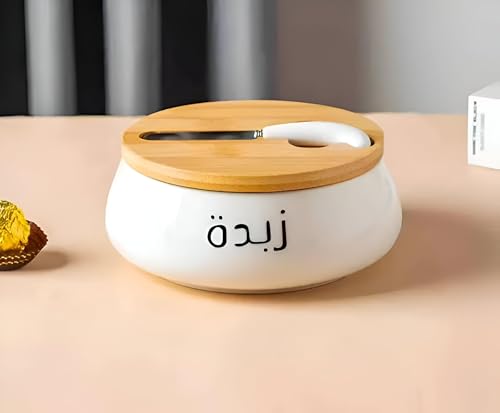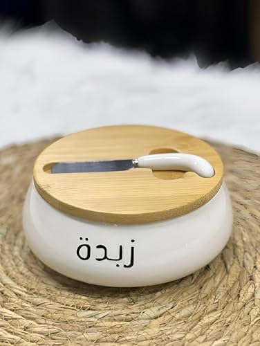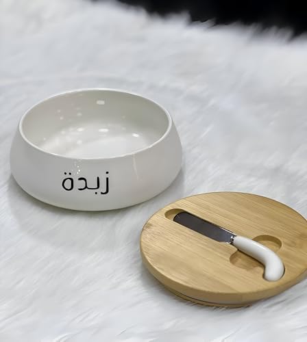 Generic - طبق تقديم الزبدة - طبق دائري من البورسلين الابيض مع نقش عربي وغطاء من الخيزران، امن للاستخدام في الميكروويف، مثالي لديكور المطبخ الحديث