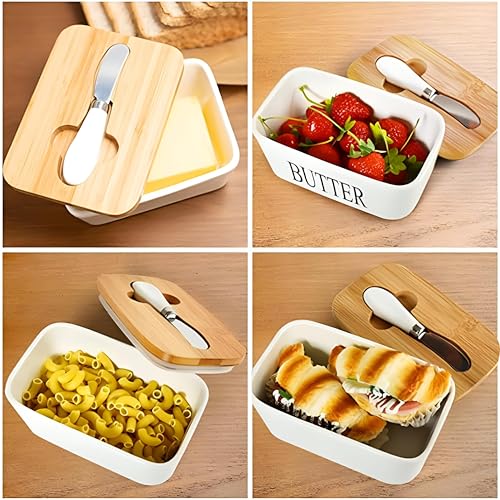 - لا يقتصر استخدام هذا الوعاء على الزبدة فقط، بل يمكنه أيضًا حفظ مجموعة متنوعة من المكونات الأخرى مثل الملح والسكر والتوابل والأعشاب. يتميّز تصميمه الأنيق والبسيط بقدرته على الانسجام بسلاسة مع مختلف البيئات، من المطابخ المنزلية إلى المطاعم الاحترافية، وحتى أماكن العمل.