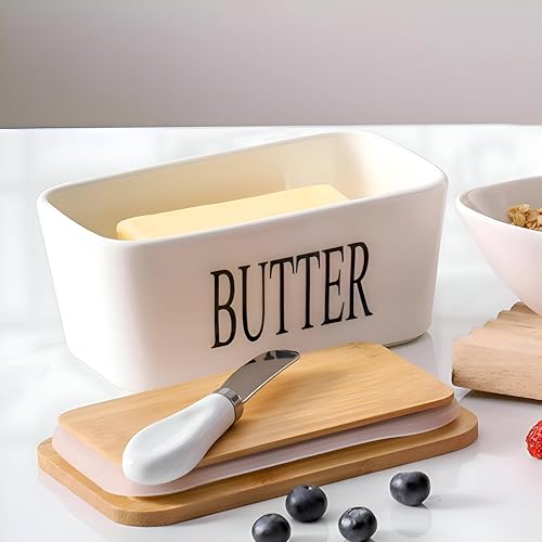 Generic - صندوق تخزين الزبدة - حاوية سيراميك واسعة مع غطاء مانع للتسرب وسكين توزيع مطابق، تتميز بمقبض سيليكون مقاوم للحرارة لضمان النظافة وتناسب ديكور المطبخ الحديث بشكل مثالي