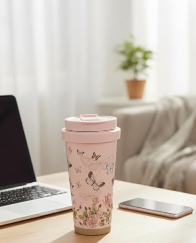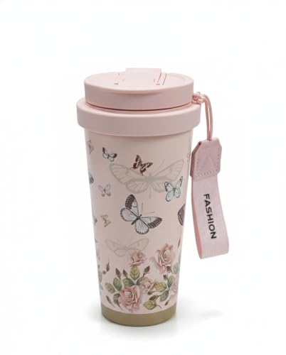 Spaceshoop - كوب سفر ستانلس ستيل بتصميم فراشة مع غطاء وحزام - كوب قهوة وشاي معزول بجدار مزدوج مع ماصة للمشروبات الساخنة والباردة، ثيرموس (1، زهري، 520 مل)