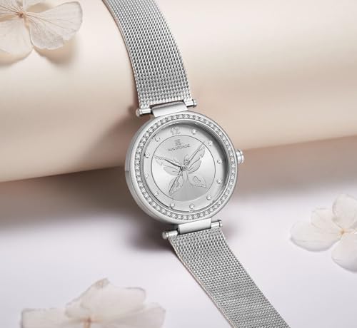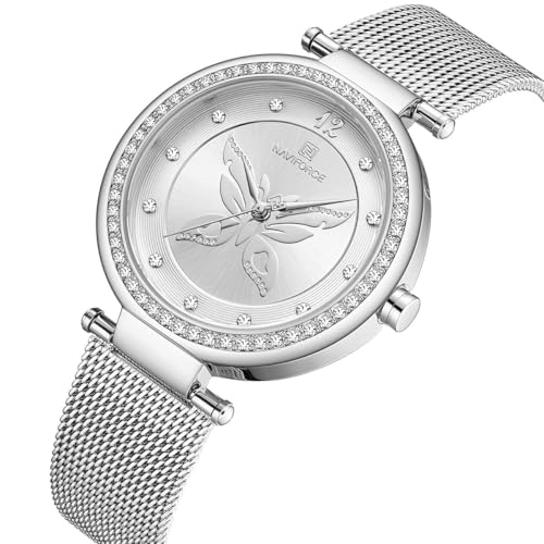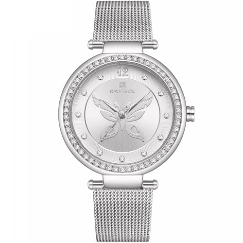 Generic - ساعة يد بتصميم فراشة للنساء، مع سوار وخرز كريستال، لون فضي، NF5018 S/W