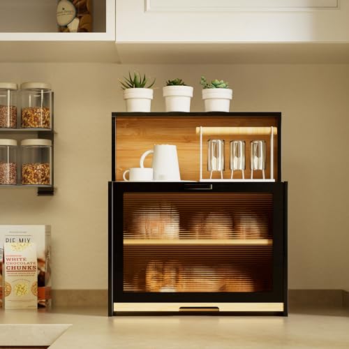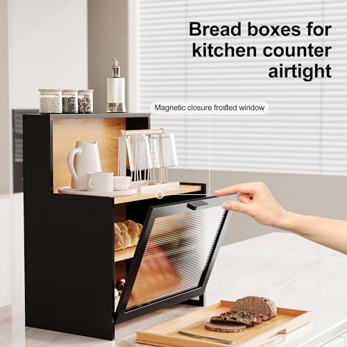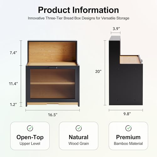 BUTUNITA - صندوق خبز من البامبو بتصميم ريفي مع لوح تقطيع محكم الإغلاق مناسب للأكواب والتوابل والوجبات الخفيفة من بوتونيتا، أسود.