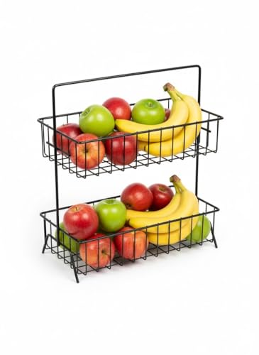 Happy Home - سلة فاكهة من 2 طبقة للمطبخ، حامل تخزين للخبز والخضروات - سلة سلكية معدنية مستطيلة، أسود عتيق