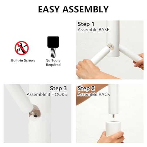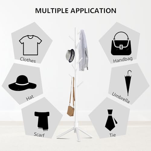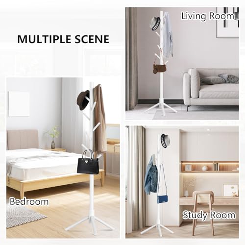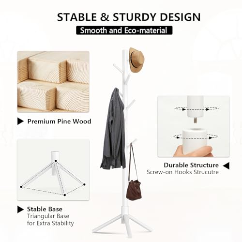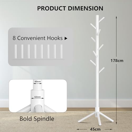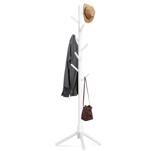 Buymoth - حامل معاطف خشبي من بايموث مع 3 ارتفاعات و8 خطافات للملابس والحقائب والقبعات، مناسب للمنزل/المكتب/المدخل/الردهة، ابيض، معدن