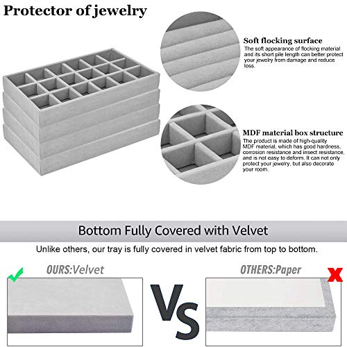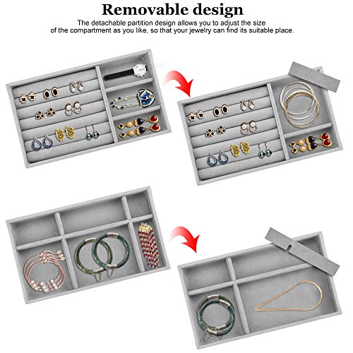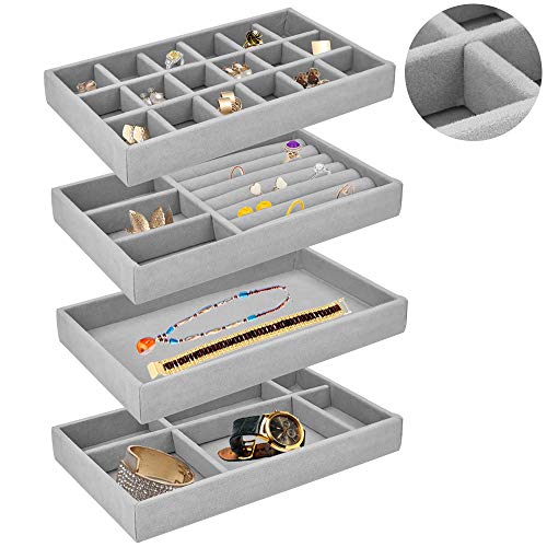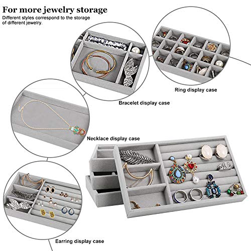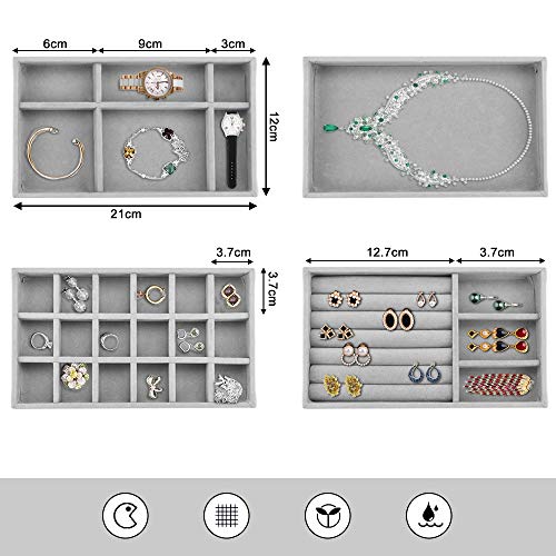 BUZIFU - صينية تنظيم المجوهرات قطيفة قابلة للرص لتنظيم المجوهرات للأدراج من بوزيفو، صينية تقسيم المجوهرات وعلبة عرض الحلقان والقلائد والأساور والخواتم، مجموعة من 4 قطع (رمادي)، مخمل