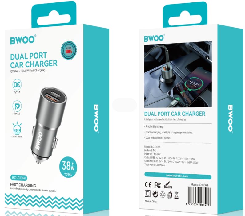 - لذلك، طورت العلامة التجارية بوو مؤخرًا شاحن سيارة سريع الشحن وفعال من حيث التكلفة مع مخرج مزدوج عالي الطاقة 38 واط، والذي يمكنه استعادة طاقة الهاتف المحمول بسرعة حتى في فترة زمنية قصيرة. أقصى طاقة لشحن ايفون مع كابل بيانات معتمد من ام اف اي تصل إلى شحن سريع بي دي 20 واط، شحن سامسونج مع كابل بيانات كيو سي 3.0 نوع سي، يمكن أن تصل الطاقة القصوى إلى 20 واط.