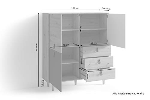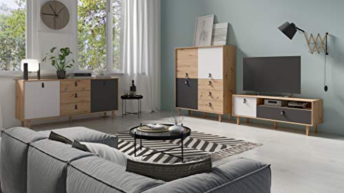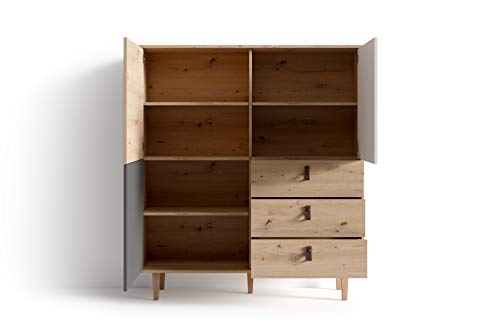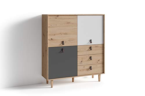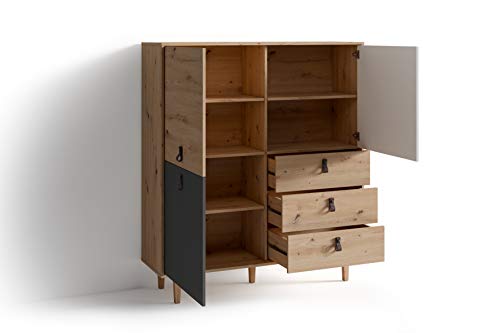 byLIVING - دولاب بلوح مرتفع لغرفة المعيشة بتصميم من خشب البلوط بلون بني فاتح مع 3 أبواب و3 أدراج، دولاب جانبي مع واجهة بلون أبيض ورمادي ومقابض حلقية عرض 1.2 م × ارتفاع 1.35 م × عمق 36.5 سم من باي ليفينج