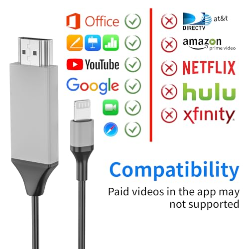 - 【التطبيقات المدعومة】يدعم كيبل محول ايفون إلى اتش دي ام اي مكالمات الفيديو من فيس تايم، سكايب، واتساب؛ ويدعم بث مقاطع الفيديو والصور والألعاب والعروض على ايه بي سي، ان بي سي، فوكس، اي دي ام بي، تويتر، ريديت، يوتيوب، كويك فليكس، فيسبوك، انستغرام، انستغرام، سناب شات، فاميلي اون تي في، مايكروسوفت اوفيس، متصفح اي اي، كروم متصفح الخ إلى كبير تلفزيون عالي الدقة مزود بمنفذ HDMI وشاشة وجهاز عرض. لاحظ أن كيبل HDMI لا يتوافق مع مقاطع فيديو نتفليكس وأمازون برايم وهولو وتلفزيون كومكاست واتش بي او جو واكس فينيتي وفودو ودايركت تي في وما إلى ذلك