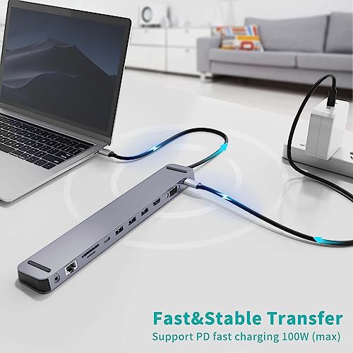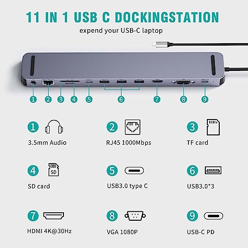 CableGlaxay - قاعدة توصيل USB نوع سي 11 في 1 مع قدرة طاقة 100 وات ومنفذ HDMI 4K وVGA وRJ45 و3 منافذ 3.0 C وSD - TF وصوت وقاعدة لأجهزة ماك بوك - اي - ديل - سيرفس - اتش بي - سامسونج فضي