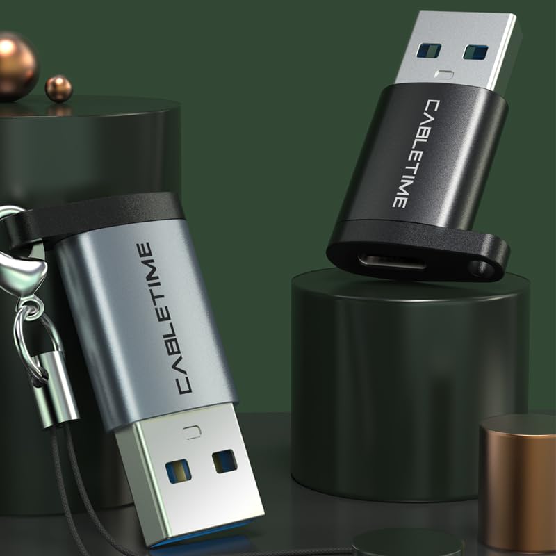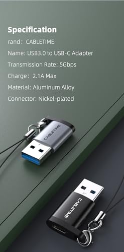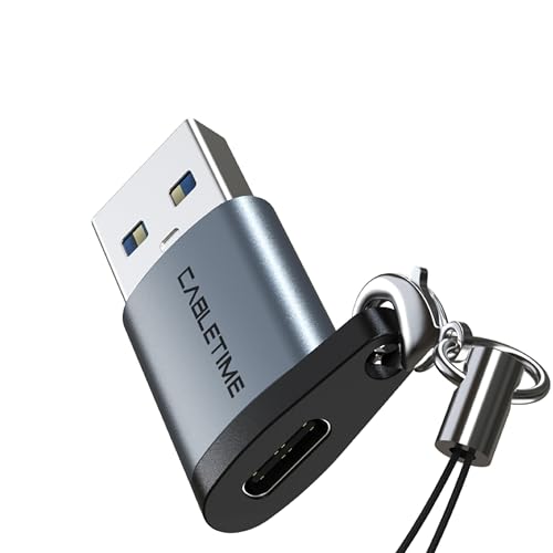 CABLETIME - كابل تايم محول USB C أنثى إلى A 3 ذكر مع حلقة حبل قصير 5 جيجابت في الثانية 2.1 امبير شحن وبيانات مطلي بالنيكل غطاء الومنيوم رمادي متوافق توجيه الحد من المواد الخطرة