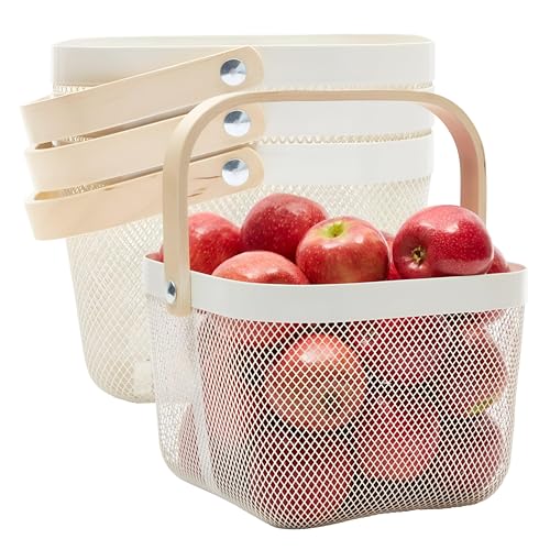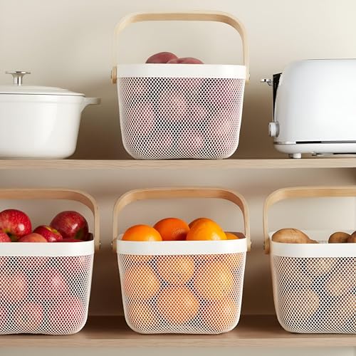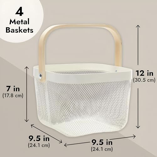 Generic - سلة فاكهة شبكية معدنية مربعة عصرية بمقبض خشبي للمطبخ، توفر مساحة تخزين وتنظيم ذكية (9.5 × 7 انش، ابيض) - ارفع مساحتك (4 قطع)