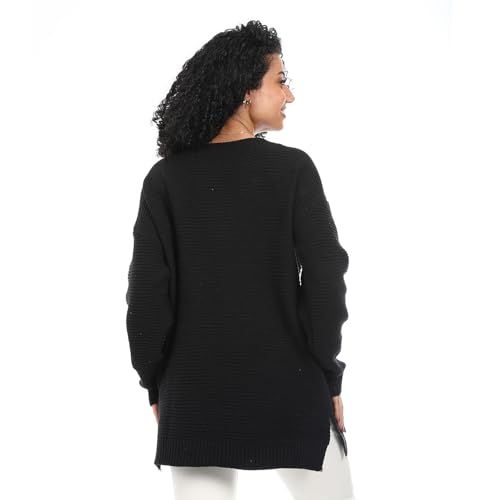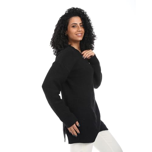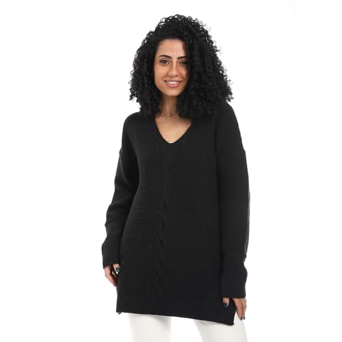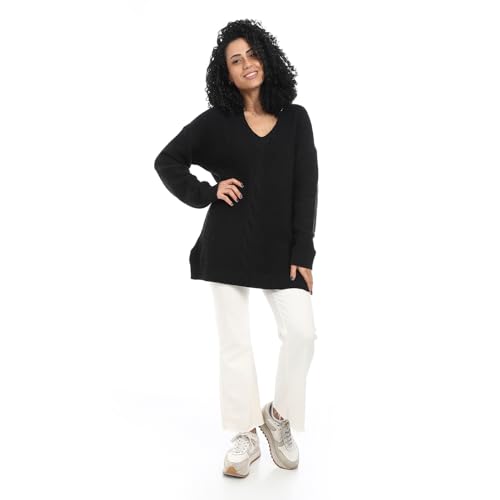 CAESAR - كنزة صوفية من سيزر برقبة V للنساء، قصة عادية بأكمام طويلة، مصنوعة من الصوف، لون أسود، مقاس موحد