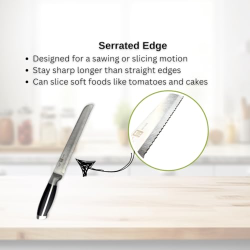 - 33 سم، الطول: تتميز بطول شفرة كافٍ لتقطيع أرغفة الخبز الكبيرة والكعك متعدد الطبقات.
