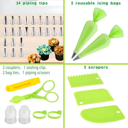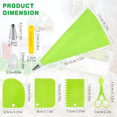 - الطقم الشامل يتكون من 35 قطعة، 24 قمع تزيين و2 كيس معجنات قابلين لإعادة الاستخدام بحجم 30.5 سم و3 مكاشط و2 وصلة ومشبك إغلاق واحد و2 رباط للكيس ومقص تزيين واحد، مما يجعله حلًا متكاملًا للمبتدئين والمحترفين في تزيين الكيك.