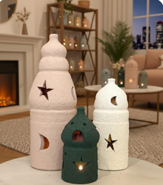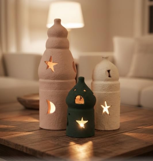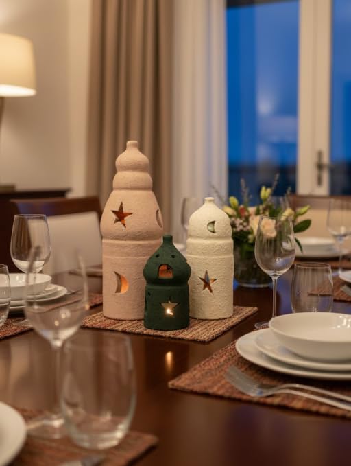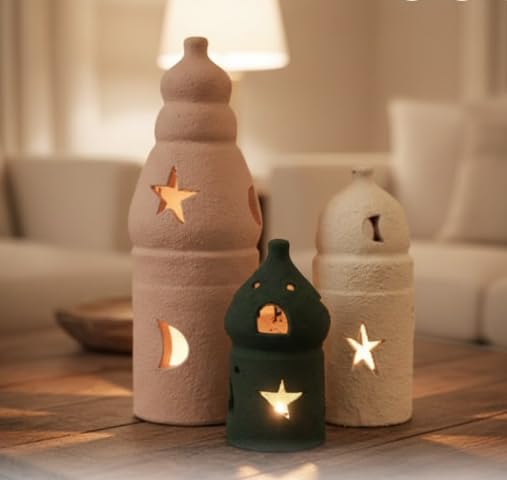 - تصميم تيراكوتا مصنوع يدويًا: مجموعة من 3 فوانيس مصنوعة يدويًا بشكل جميل تتميز بنمط الفانوس المصري التقليدي مع فتحات معقدة على شكل نجوم وقمر تخلق أنماط إضاءة ساحرة عند إضاءتها