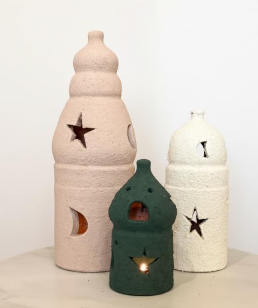 مجموعة من 3 فوانيس رمضان مصنوعة يدويا من الطين من كالدا، بفتحات نجوم وقمر، نمط مصري تقليدي، كريمي، خوخي، بني تيراكوتا، ارتفاع 25 سم (اخضر)