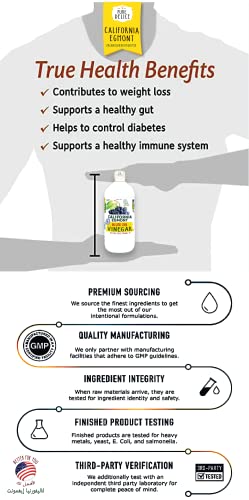- المكونات الطبيعية: خل التفاح مع الأم (الخام وغير المصفى وغير المبستر) لتحسين الهضم وصحة القلب وتقليل الكوليسترول/الخدر وتقليل ضغط الدم وتقليل ليلة النوم وما إلى ذلك.