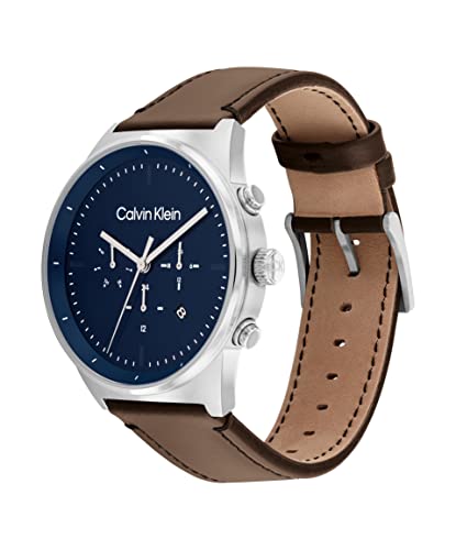 Calvin Klein - ساعة كوارتز أنالوج متعددة الوظائف للرجال بسوار جلد بني غامق من كالفن كلاين - 25200300، مينا أزرق