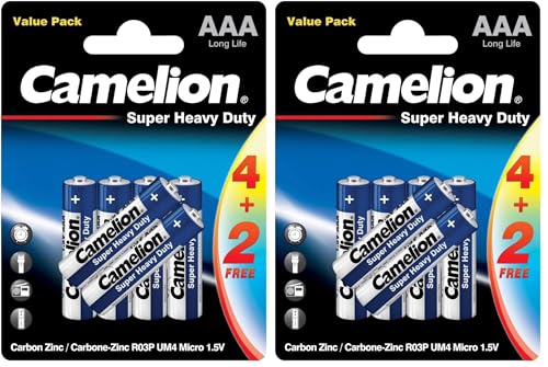 Camelion - بطاريات زنك وكربون شديدة التحمل من نوع AAA من كاميليون - 4 قطع + قطعتان مجانيتان (عبوة من قطعتين)