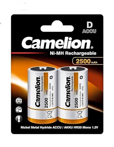 Camelion - بطاريات قابلة لاعادة الشحن 2500 مللي امبير/ساعة نوع D من كاميليون، عبوة من 2، 1.2 فولت، قلوي