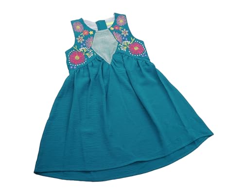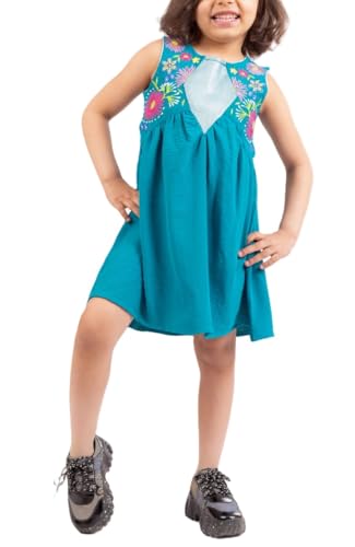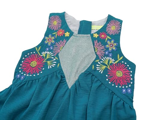 Cameron Jeans - فستان بدون أكمام كاجوال مطرز بالزهور قطن بوبلين للبنات من كاميرون جينز، لون أزرق مخضر، طول قصير