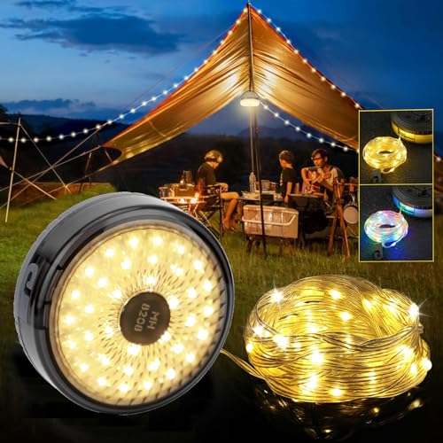BlueEour - سلسلة مصابيح للتخييم مع بكرة أضواء خيالية قابلة للطي (8 م)، مصابيح تخييم قابلة لإعادة الشحن للخيام مع 5 أوضاع إضاءة وباور بانك متنقل 1200 مللي امبير في الساعة، مصباح للتخييم