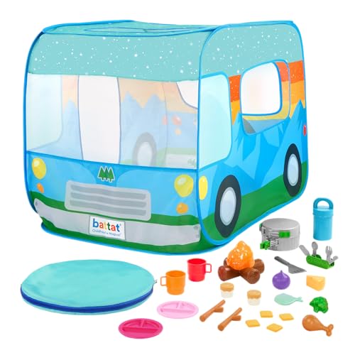 • مجموعة أدوات تخييم كاملة: خيمة لعب منبثقة مع نوافذ شبكية تأتي مع أكثر من 15 ملحق تخييم بما في ذلك أطعمة لعبة وأدوات الطبخ وأدوات التخييم للمغامرات الخيالية في الهواء الطلق.