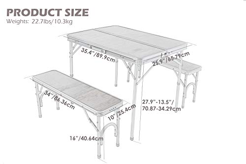 - محمولة وخفيفة للغاية: حجم طاولة التخييم القابلة للطي: 35.4 بوصة × 25.9 بوصة × 13.5 بوصة/27.9 بوصة، حجم المقعد: 34 بوصة × 10 بوصة × 16 بوصة. الوزن 10 باوند فقط، مجموعات طاولات نزهة محمولة وخفيفة الوزن وقابلة للطي.