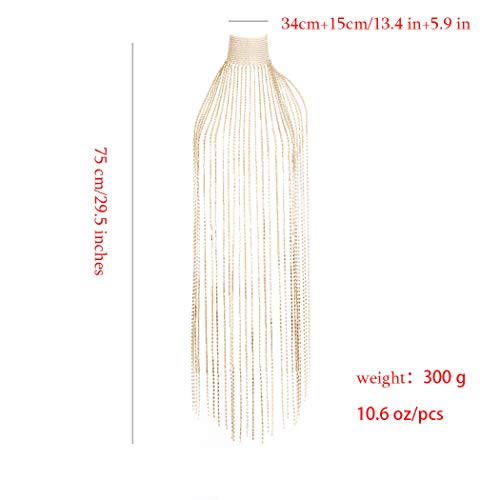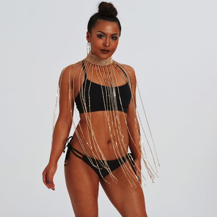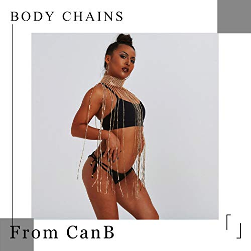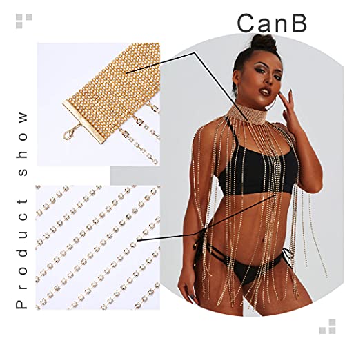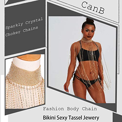 CanB - كان بي سلسلة طويلة للجسم مرصعة بحجر الراين، سلسلة ذهبية كريستالية بشراشيب، سلسلة قلادة بكيني للشاطئ والنوادي الليلية والحفلات، اكسسوارات للجسم مجوهرات للنساء